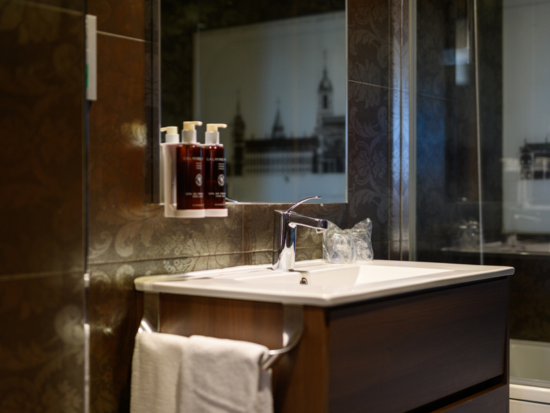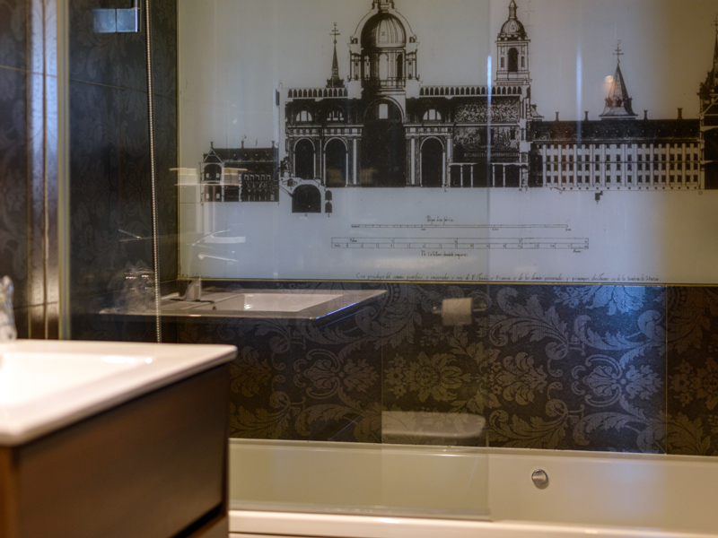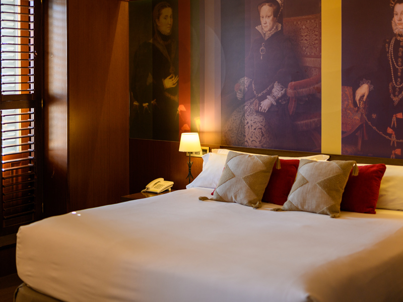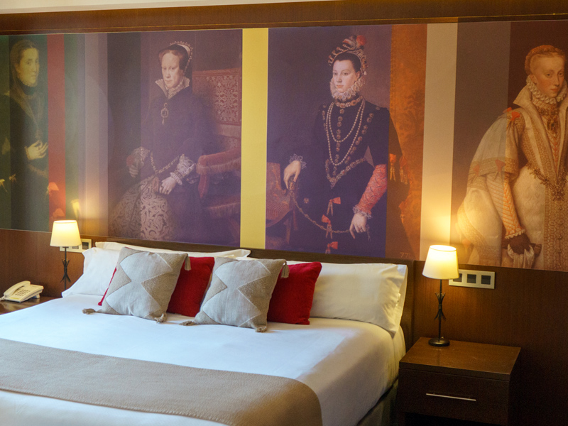 Una de las habitaciones superiores con bañera de hidromasaje más especiales, tanto por su nombre, como por sus vistas. Está ubicada en la planta tercera, forrada de madera color wengue y con imágenes de Felipe II y sus esposas. Dispone de bañera hidromasaje y dos balcones desde los que se ve el Monasterio de San Lorenzo.