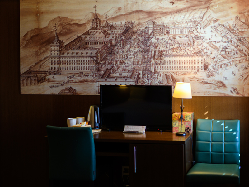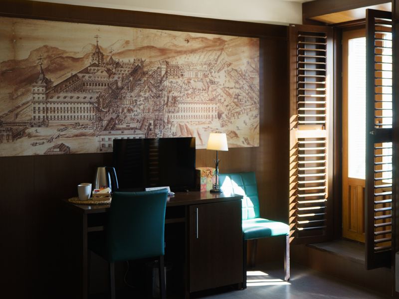 Esta amplia habitación, además dispone de dos balcones con vistas al Monasterio de San Lorenzo del Escorial